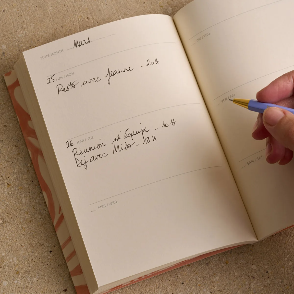Gardez toujours un oeil sur votre planning grâce à notre agenda perpétuel. Avec lui, pas de dates pré-imprimées, c’est vous qui décidez ! Son format pratique vous permettra de l’emporter partout avec vous, ses pages Notes et Dates importantes de ne rien oublier, et ses 144 pages de consigner tous vos rendez-vous et projets. Son motif Swinging sun, Vichy dessiné à la main dans une teinte jaune fruitée, donnera une touche retro à votre bureau et illuminera vos journées.